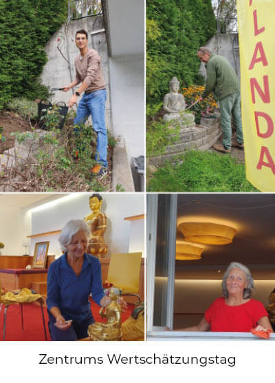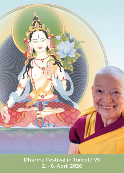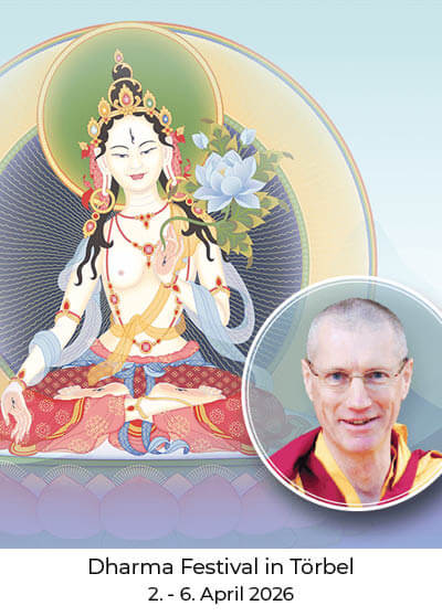 “Dharma” bedeutet Schutz. Durch das Praktizieren von Buddhas Unterweisungen schützen wir uns vor Leiden und Schwierigkeiten. Alle Schwierigkeiten, die wir im täglichen Leben erfahren, entspringen der Unwissenheit, und die Methode, diese Unwissenheit zu beseitigen, besteht in der Dharma-Praxis. Das Praktizieren des Dharmas ist die beste Methode, die Qualität unseres menschlichen Lebens zu verbessern. Die Lebensqualität hängt nicht von äußeren Entwicklungen oder materiellem Fortschritt ab, sondern von der inneren Entwicklung von Frieden und Glück.